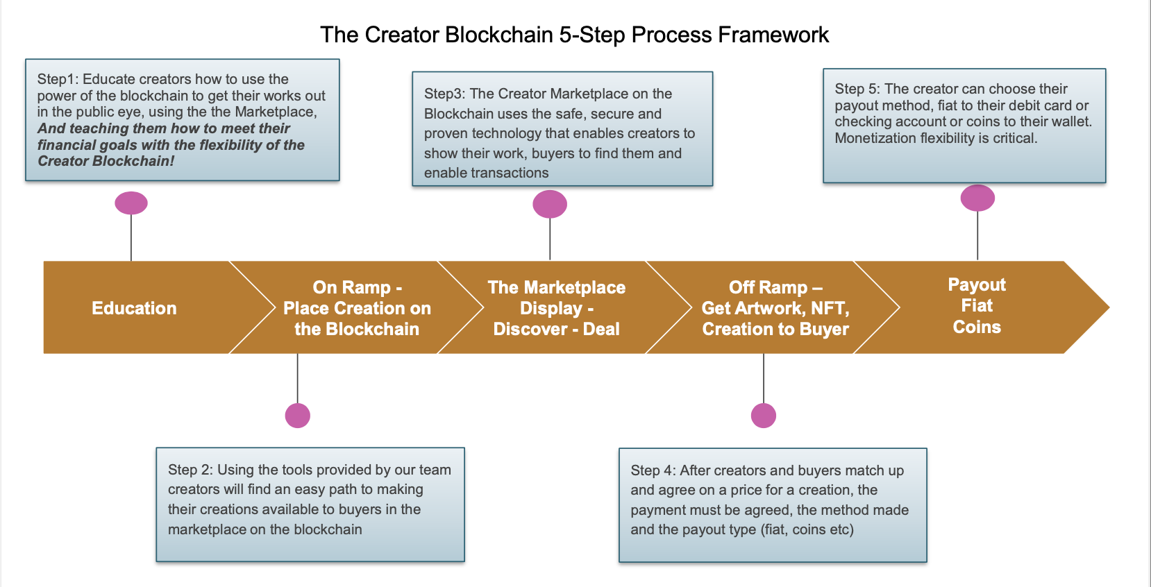 3. Expert, fee-based service - whereas a member of the CBP team will actually do the work for the creator/user. In other words, for a nominal fee, an "expert" will complete a guided step-by-step tour of the process for such things as digitizing the work; minting an NFT; creating a smart contract, etc. The expert will encourage and guide creators through their developmental journey by allowing the creator to simply observe utilization of the technology.